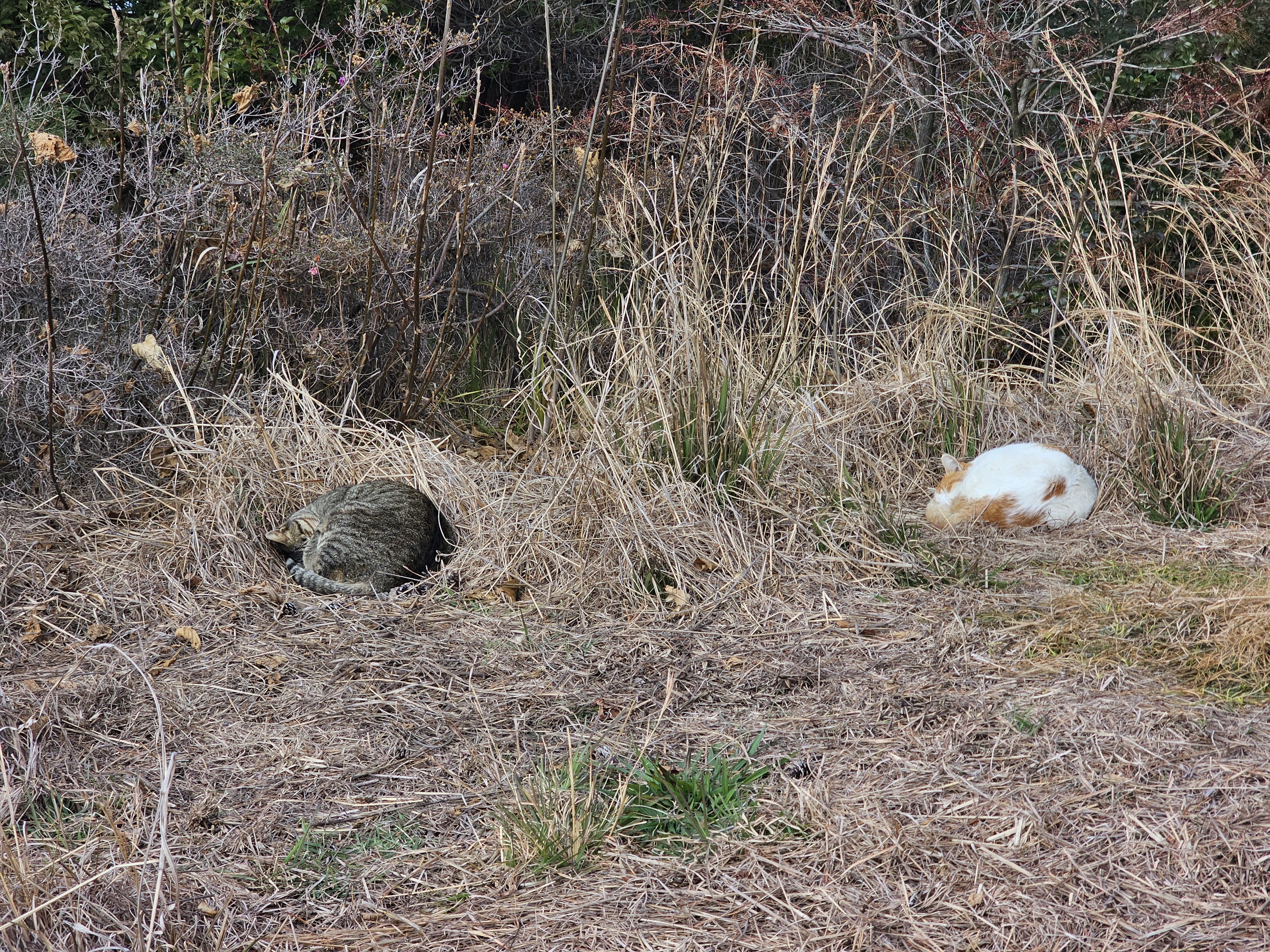따뜻한지 풀을 이불 삼아 고양이들이 잠을 잔다.