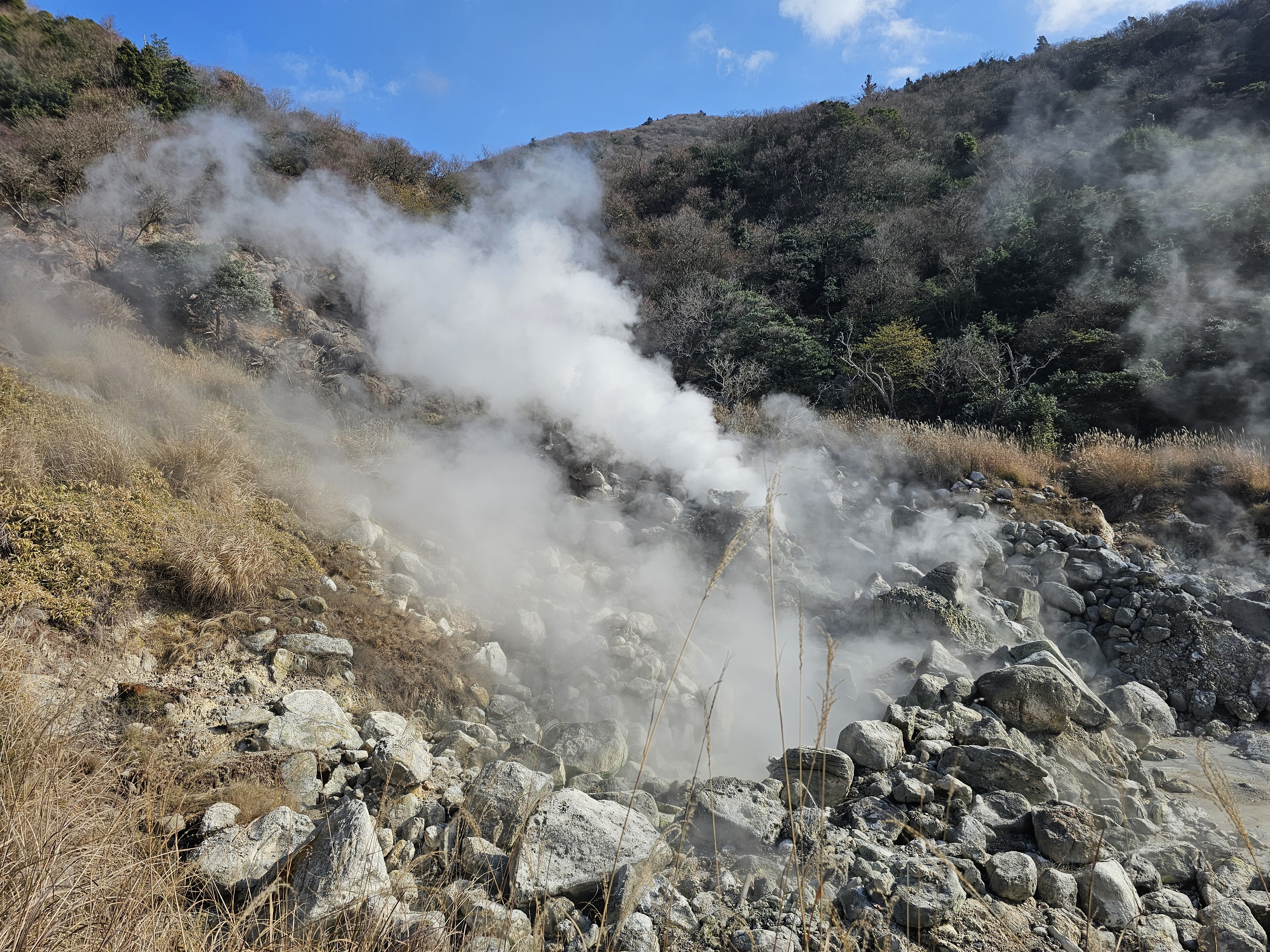 길만 지나가도 이런 바위에서 유황가스가 분출된다.
