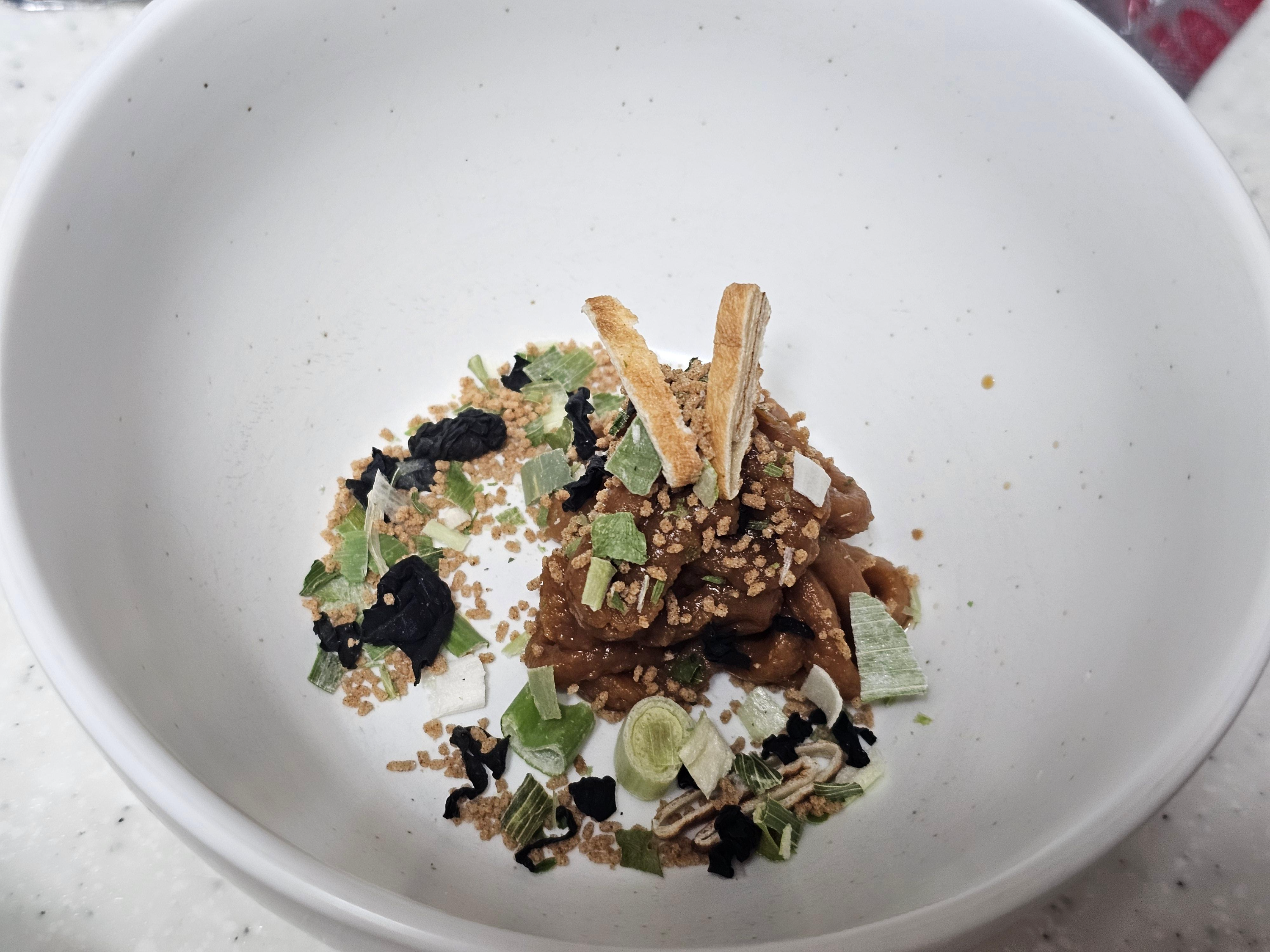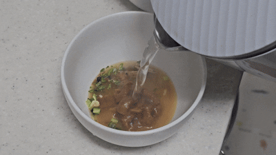 후레이크 하나와 액상 스프 하나로 이루어져 있어 뜨거운 물만 있으면 바로 완성된다.